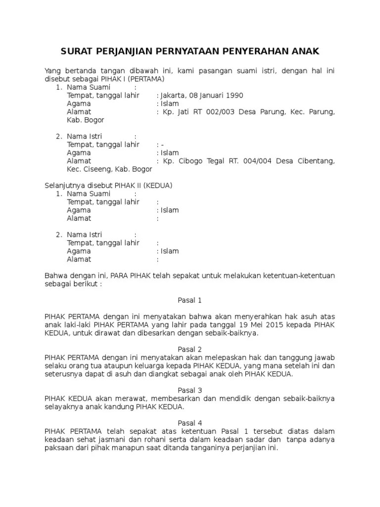 Surat Perjanjian Penyerahan Anak Angkat : Contoh Surat Perjanjian Hak Adopsi Anak Baru Lahir Aneka Otosection. Surat pernyataan penyerahan anak yang bertanda tangan di bawah ini kami pasangan. 7/23/2019 surat pernyataan penyerahan anak.doc 1/3surat perjanjian pernyataan penyerahan anakyang bertanda tangan dibawah ini, kami pasangan suami istri, . Bagaimana cara agar bisa mengambil kembali anak saya? Apakah secara hukum surat itu sah? Dengan hormat saya yang bertanda tangan dibawah .